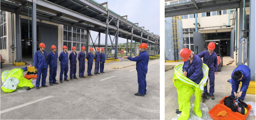 培训过程,消防专业严汉生首先为大家细致讲解重型防护服的结构、组成部件、正确穿戴方式及日常维护方式方法。随后,就重型防化服的佩戴与使用方法进行了演示说明,并与员工共同分享交流了化工行业多起因有毒有害气体泄漏、安全防护用品使用不当造成生产事故的案例。员工们积极互动,依次上前进行重型防化服的穿戴训练,车间主任也对佩戴中出现的相关问题进行细致纠正。